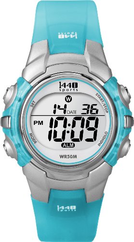 The Timex Women's T5K460 1440 Sports Digital Mid-Size Watch offers a crisp, digital dial with a 24-hour chronograph, 24-hour countdown timer, and a daily alarm. It's ideal for your daily running, swimming, or jogging routine. Plus, it offers a two time zone setting that makes traveling easy. An Indiglo® night-light features allows you to tell time even in low-light conditions while a durable, acrylic window offers protection from scratches and nicks. For a fun pop of color, the durable bezel, case, and watch strap are made from strong, blue resin with a cool translucent look. The watch is equipped with reliable quartz movement and is water-resistant to 165 feet (50 meters).